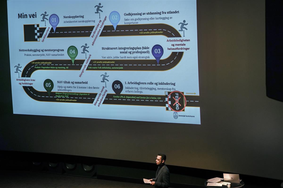 På scenen møtte vi også tidligere deltakere ved Arendal voksenopplæring, som fortalte om sine opplevelser i med møte med norsk arbeidsliv. To av dem møtte vi også under fjorårets konferanse. Da var de jobbsøker. Nå er de begge i jobb, der også medbragt faglige kompetanse ble anerkjent. Under konferansen fikk også nåværende deltakere i klassen Akademisk norsk ved Arendal voksenopplæring, anledning til å synliggjøre sin faglige kompetanse fra scenen. Det har allerede ført til spennende koblinger til arbeidslivet.