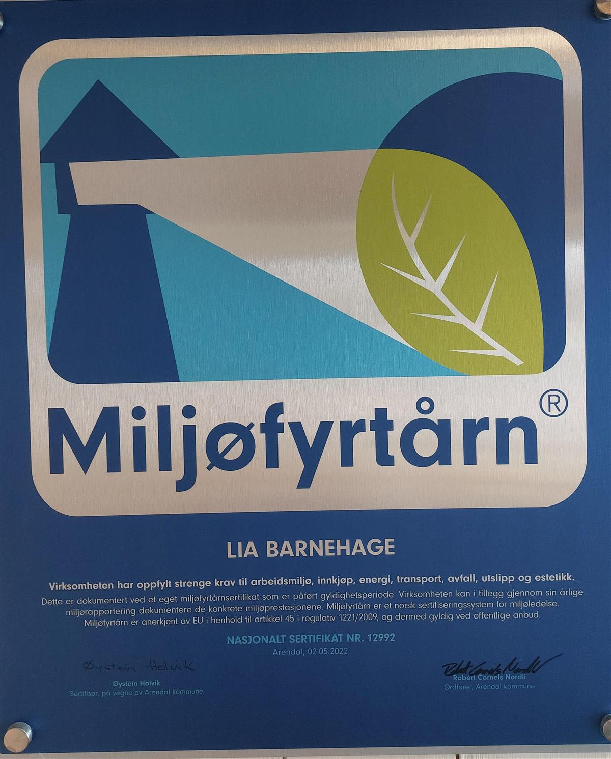 Miljøfyrtårn - Lia barnehage er miljø sertifisert.