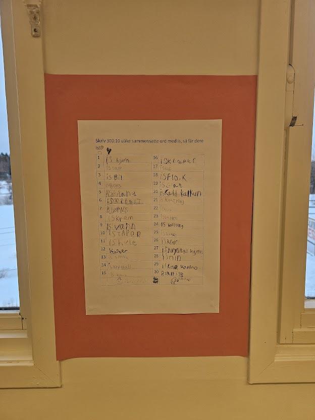 - Skriveoppgave der elevene skulle skrive 30 sammensatte ord med is (se bildet)