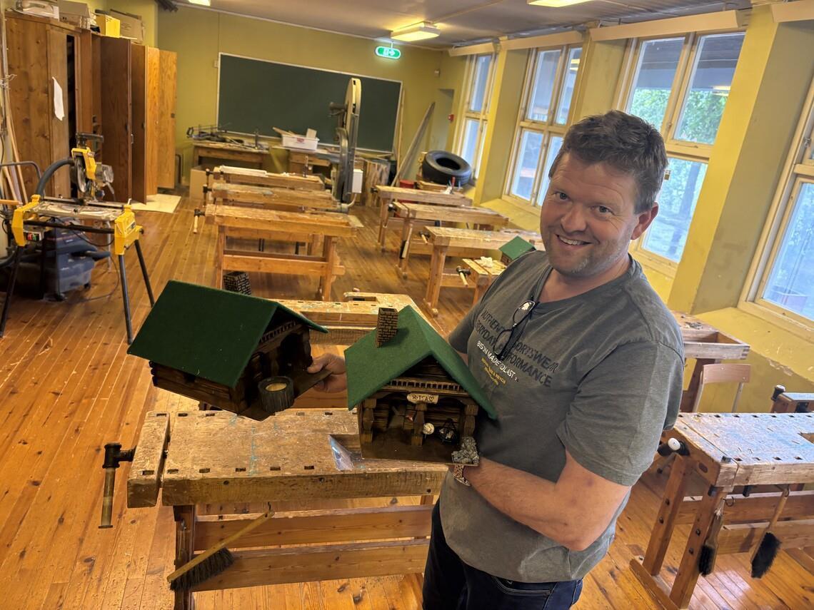 Kunst & håndverkslærer Jan Erik Torp viser frem et av miniatyrhusene som blir laget av elevene ved Nesheim skole.