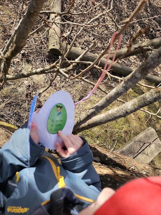 Etterpå var det påskeeggjakt med oppgaver fra Påskeharen. De utførte ulike oppgaver som; gå baklengs bort til gymsalen, danse til «Easter Bunny Dance and Freeze», synge en påskesang og telle bokstavene i ordet «Bibliotek» og hvor mange stavelser ordet.