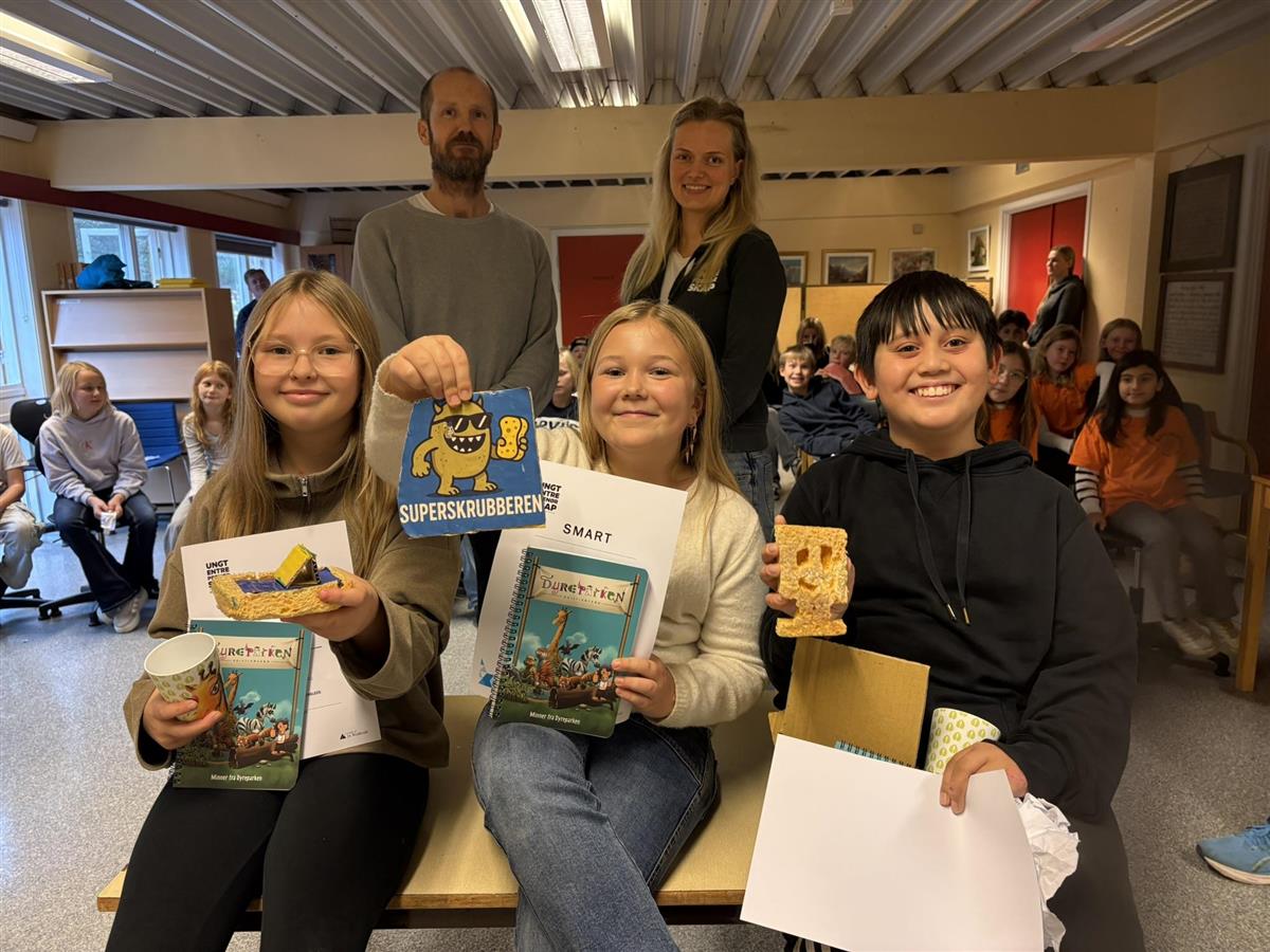 Mellomtrinnet på Nesheim skole hadde SmartUke. Superskrubberen vant! Bak står Kitron-ingeniør Guttorm Tveit og UE-representant Sara S. Bernes. Duoen satt i dommerpanelet sammen med skolens rektor.