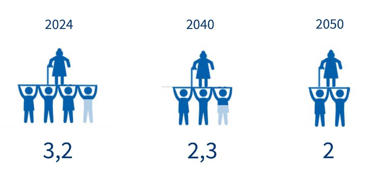 Dette betyr at aldersbæreevnen (forsørgerbrøken) vil gå ned fra 3,2 i 2024 til 2,3 i 2040, og videre ned til 2 i 2050. Aldersbæreevnen (forsørgerbrøken) er forholdstallet mellom antall personer i arbeidende alder (20-66 år) og antall pensjonister (67+).