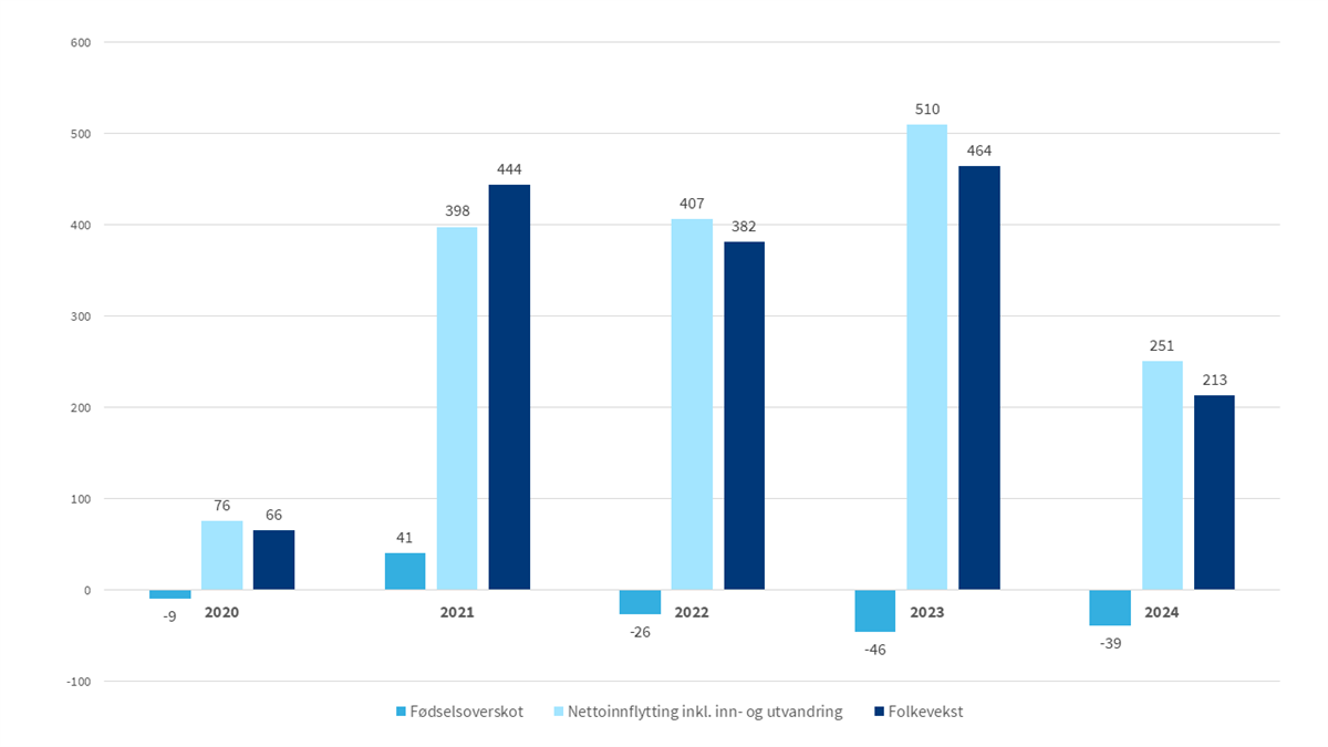 I 2024 økte folketallet med 213 innbyggere. Dette utgjør en befolkningsvekst på 0,46%.