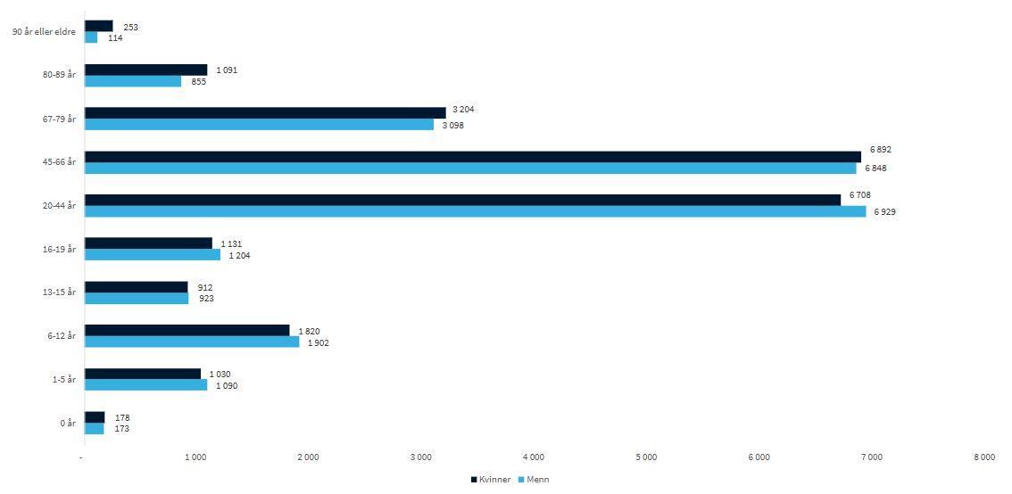 Det er 23 136 menn og 23 219 kvinner. Menn er i flertall i aldersgruppene under 45 år, mens kvinner er i flertall fra 45 år og oppover.