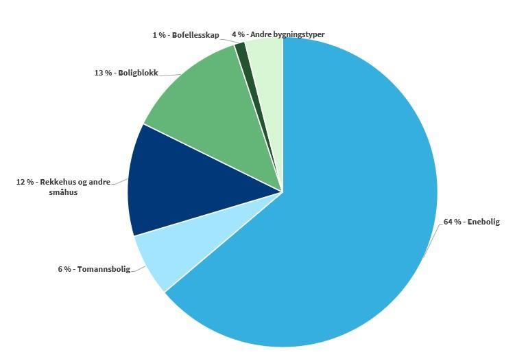 Kakediagrammet under viser andelen boligtyper i Arendal pr. 1.1. 2025. Eneboliger utgjør 64 % av boligene i Arendal - totalt 14 651. Vi henter tallene fra SSB og oppdaterer de årlig.