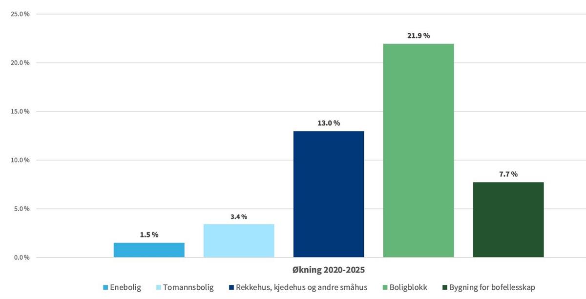 Tabellen under viser veksten fordelt på boligtype fra 2020 til utgangen av 2024. Boligblokker har økt mest med 21,9 %. Vi henter tallene fra SSB og oppdaterer de årlig.