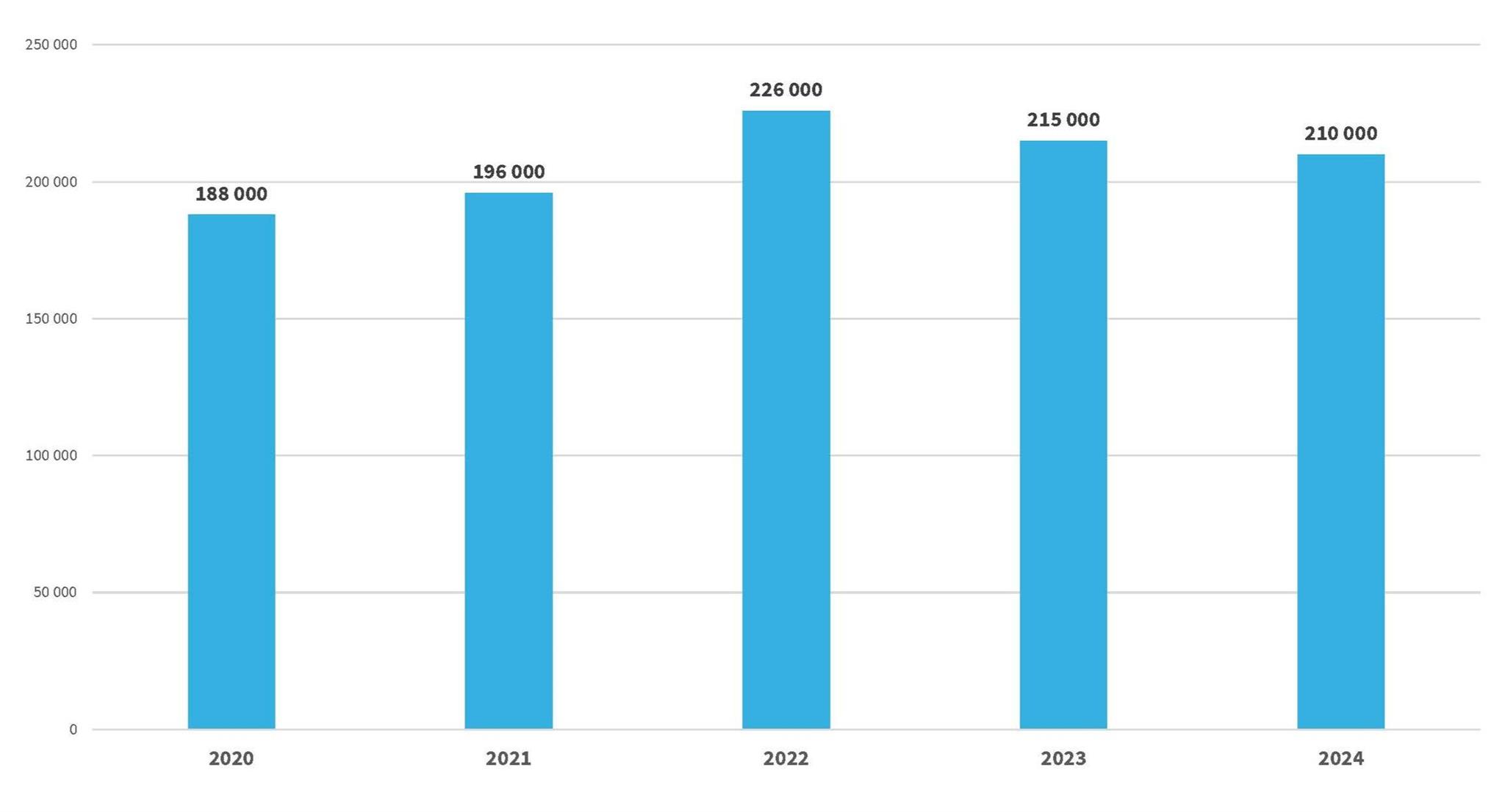 I Arendal har vi 5 målepunkter for sykkelpasseringer. Tabellen under viser totalt antall passeringer for sykkel i Arendal fra 2020 – 2024. I 2024 var det 210 000 passeringer.