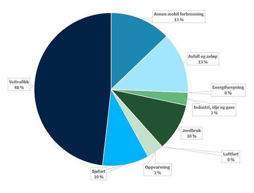 Sirkelen under viser klimagassutslipp i Arendal fordelt på sektor i 2023. Ca. 70% av utslippene kommer fra transportsektoren.
