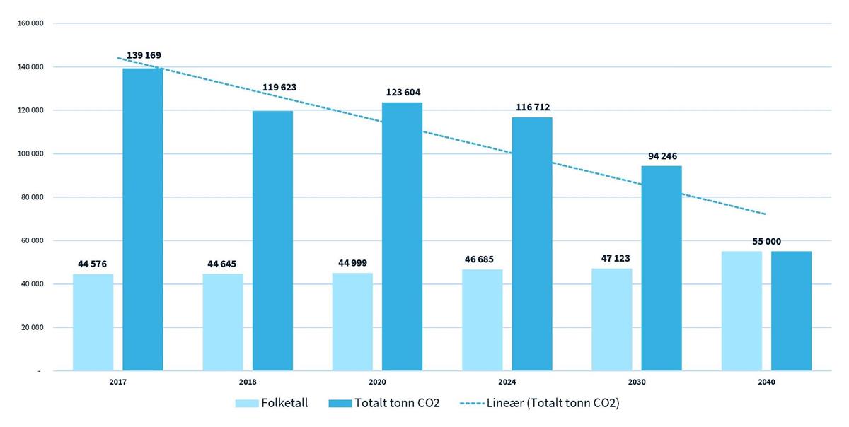 Agder fylkeskommune har laget referansebaner som viser framskriving for alle kommunene i Agder. Tabellen under er for Arendal og viser hvordan reduksjonen bør gå i takt med målet om befolkningsvekst. Tallene anslår at Arendal vil ha et klimautslipp på litt over 94 000 tonn CO2e i 2030. Det er det langt unna målet om 1 tonn Co2 pr. innbygger i Arendal.