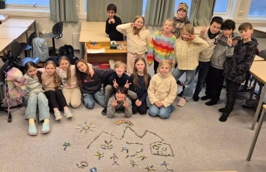 Batteribildet ble skapt i felleskap. Og etter god planlegging, og enda bedre gjennomføring, vokste kunsten fram i klasserommet. På gulvet spratt det fram sol, fjell, hus og mennesker. Et lite stykke hverdagsrealisme her, altså!