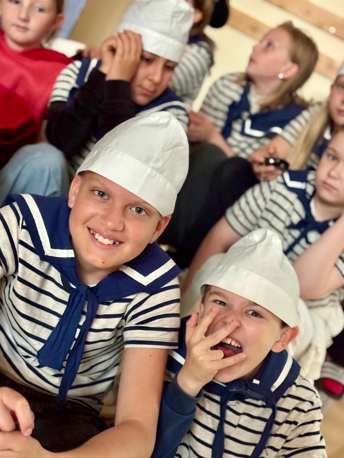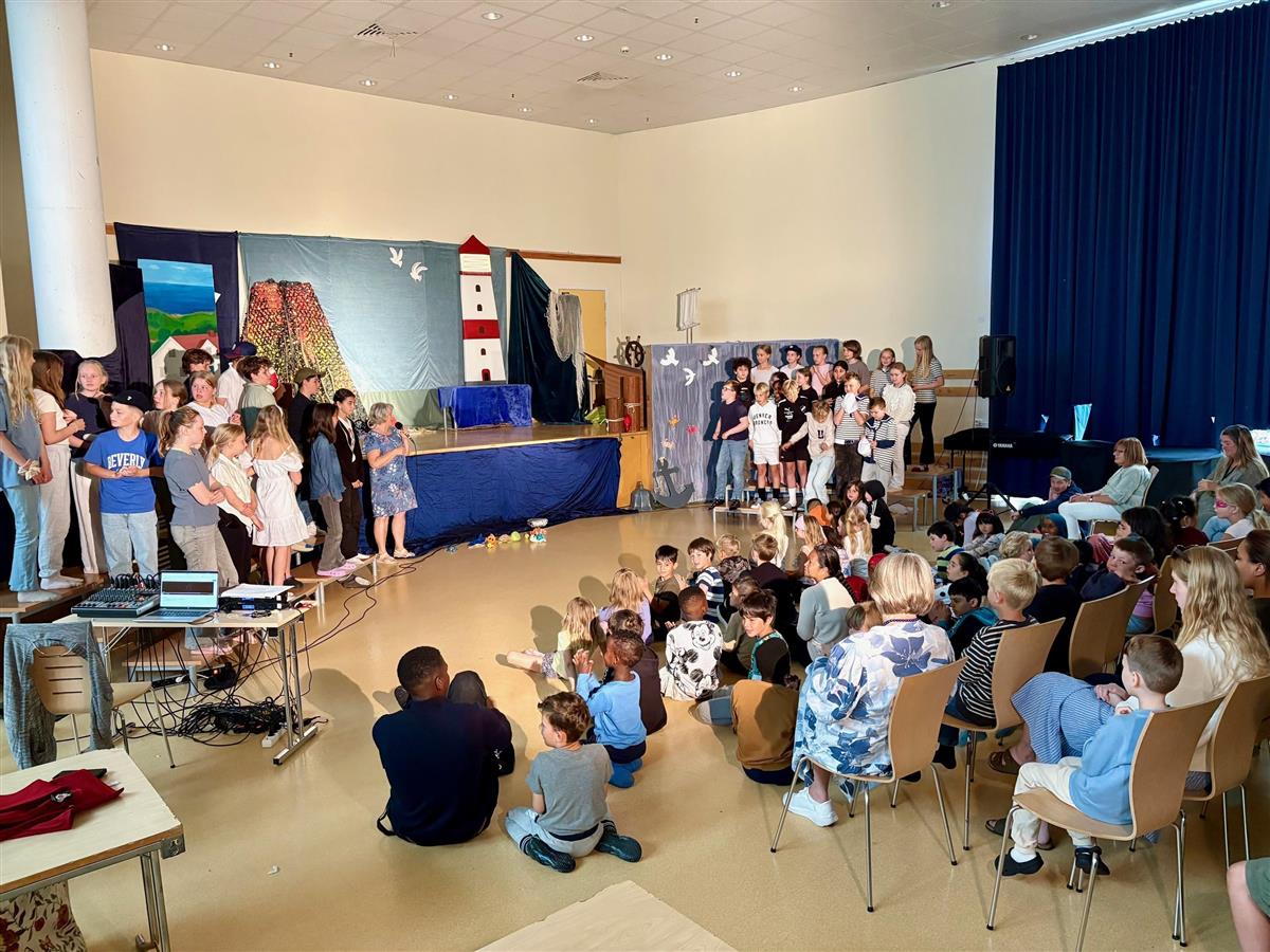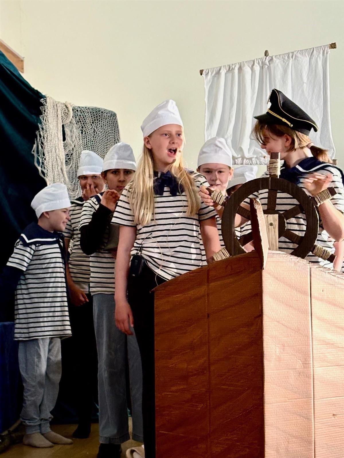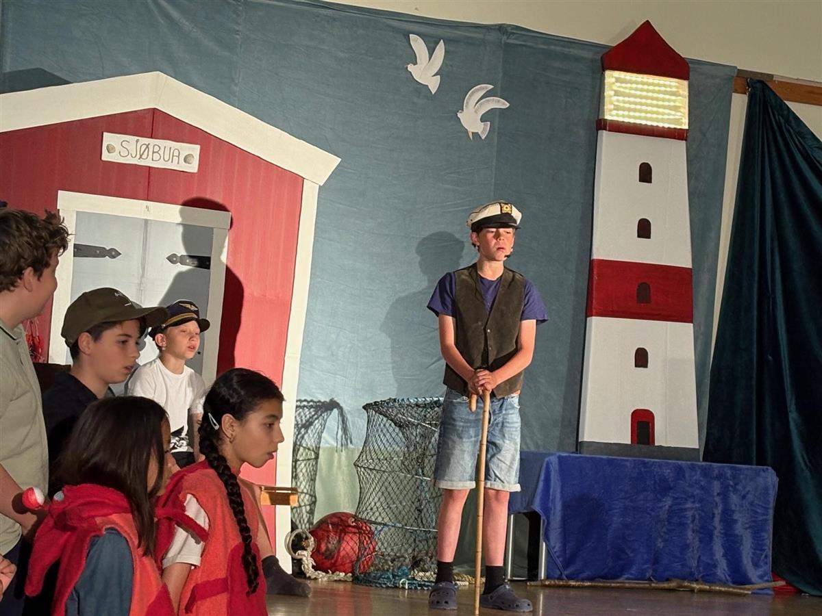 Feiende flott forestillingElevene på 5. trinn blåste publikum av banen da de satte opp forestillingen “Los-Reinert på tokt”.De siste ukene har 5. trinn øvd på en forestilling som heter “Los-Reinert på tokt”. Og tirsdag var det tid for å vise fram resultatet.Skuespillet er basert på bøkene til Siri E. Mohr, og det er tvers igjennom sørlandsk. Her var det både skuter, teiner, sjøbod, krabber, matroser og hummere. Elevene briljerte med både sang, skuespill og dans. Først var det alle elevene på barnetrinnet som fikk gleden av å se på. På kvelden var det familiene som var i salen. Og publikum var heftig begeistret!Forelder Marianne Pedersen Westbye var ansvarlig for kulissene og store deler av kostymene. Og det ble fantastisk! Vi er mektig imponert. Tusen takk til alle sammen - for en feiende flott forestilling! Sist endret 18.06.2025 08.32