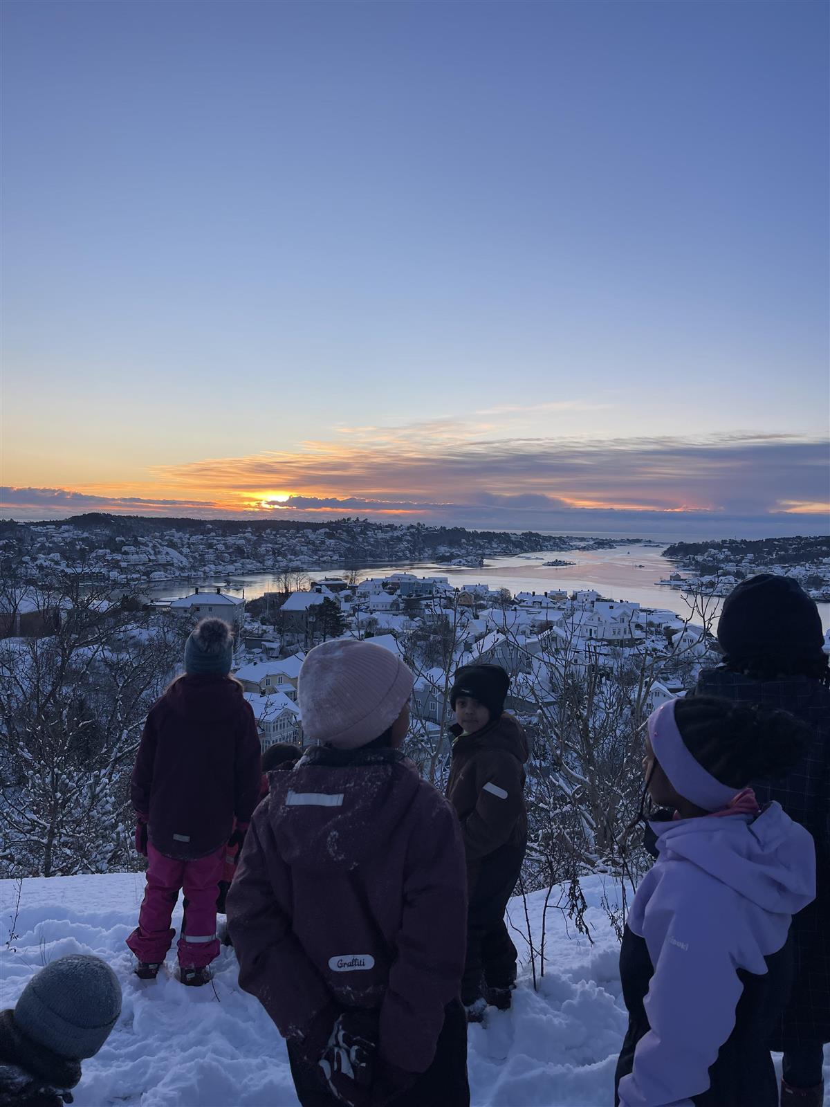 Forleden gikk de av gårde til Fløyheia idet skoleklokka ringte, og da rakk de soloppgangen over Tromøya. Det ble en vakker seanse. Vi trenger lys i ansiktet nå i vintermørket. Og samtidig kunne elevene oppleve hvor vakkert en soloppgang kan være, med sterke pastellfarger på himmelvelvingen. Nesten som et maleri!