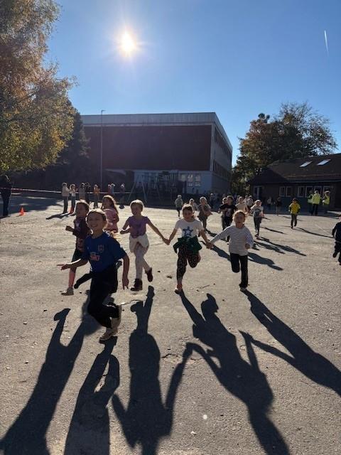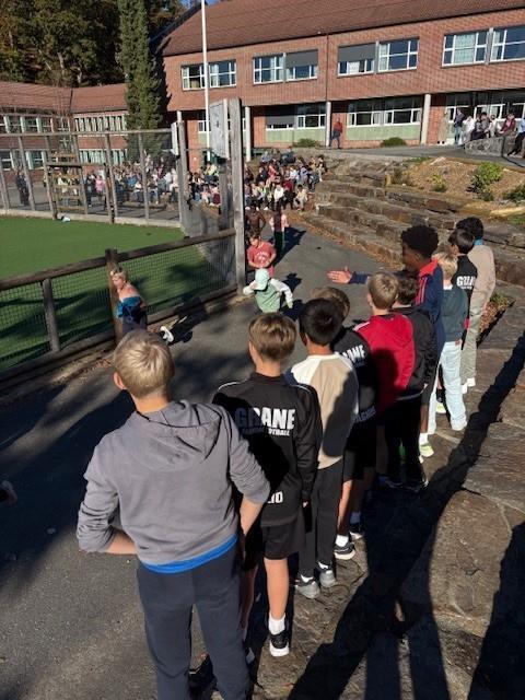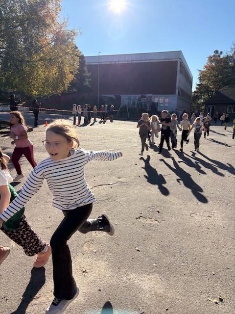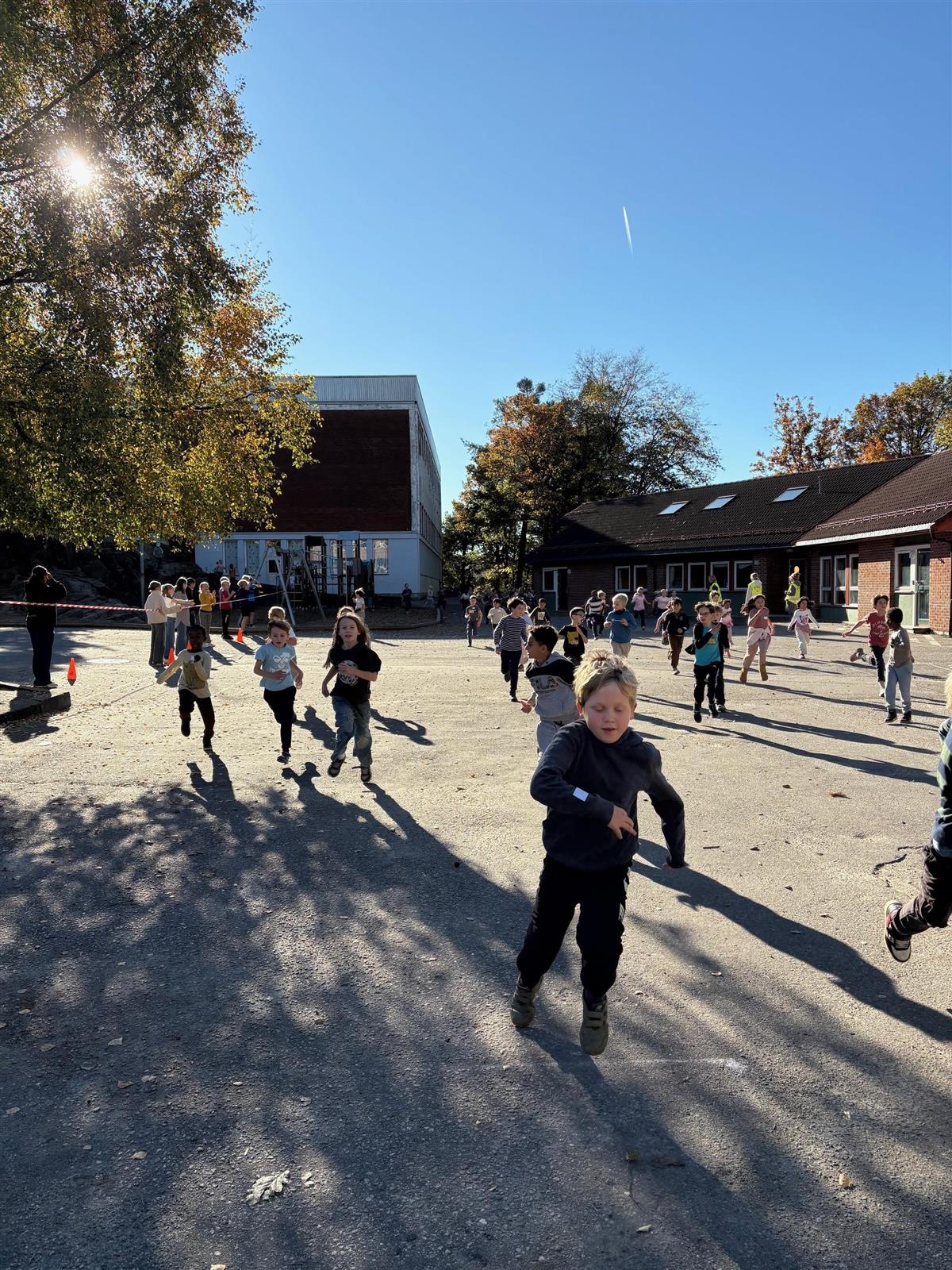 I dag gjennomførte vi det årlige skoleløpet vårt. Alle elevene, fra 1. til 10. trinn, deltok. Elevene løp en merket løype i skolegården, og jo flere runder de klarte å gjennomføre, desto flere kroner triller det inn kroner fra sponsorene (les: foreldre og andre voksne).