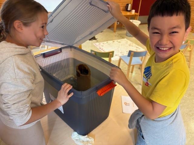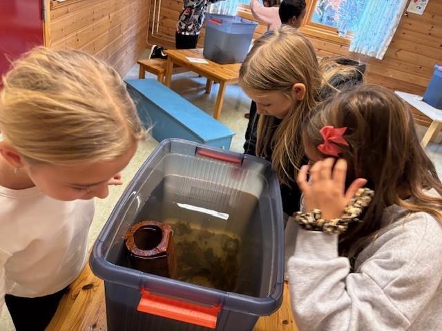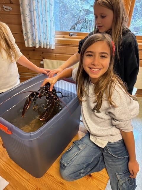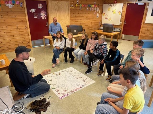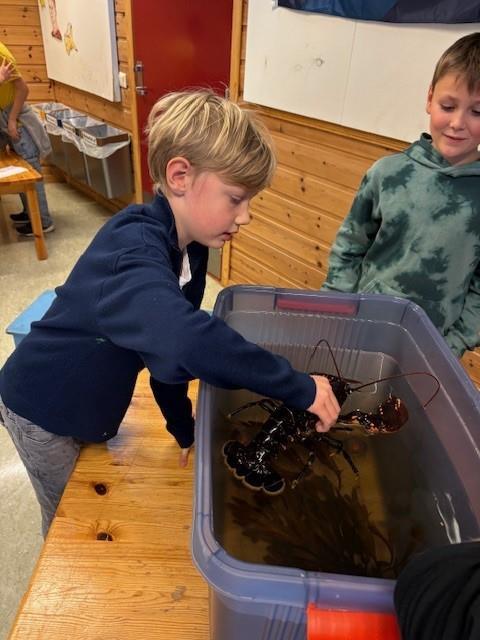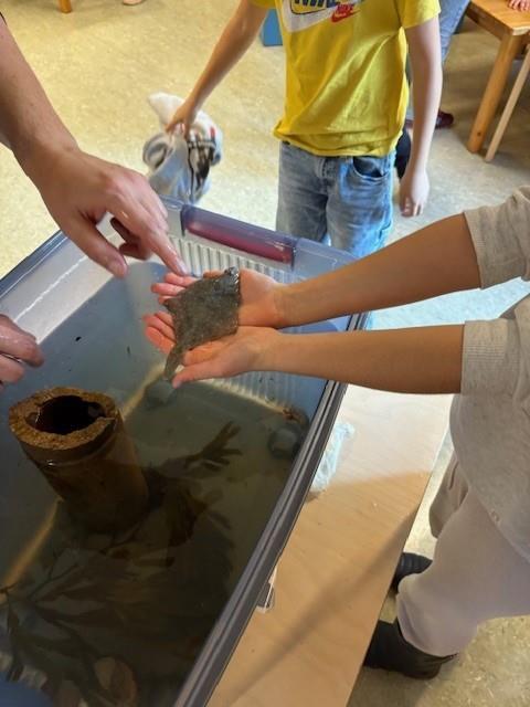 Elevene fikk se, og ta på, både blåstål, flyndre, krabbe og hummer. Og de var gøyale, klisset, glatte, sprellet og sprutet! Vi snakket om livet i fjæra og under havoverflaten, og hvor viktig det er at vi mennesker gjør det vi kan for at havet er rent nok til at livet får leve videre, også i framtida.
