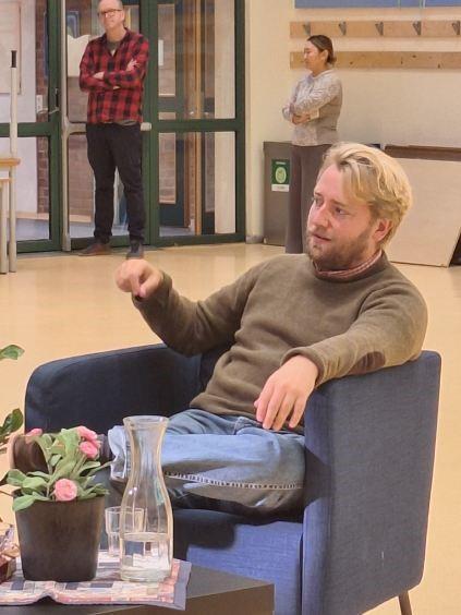 Den unge politikeren stilte til “talk show” i Storsalen på Stinta, foran alle elevene på ungdomstrinnet. I samtale med avdelingsleder Fred Arthur Asdal fortalte han at skolegangen ikke var enkel, men at det gikk bra - til slutt.