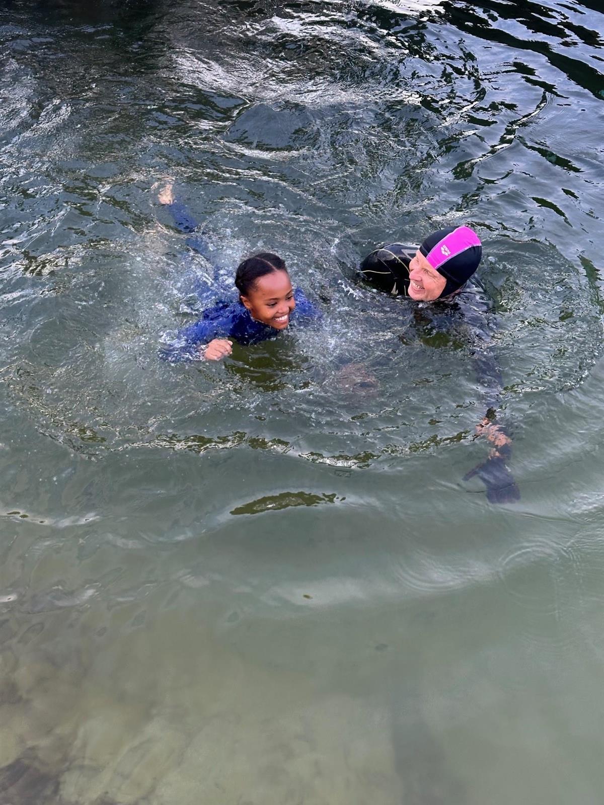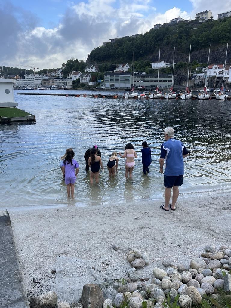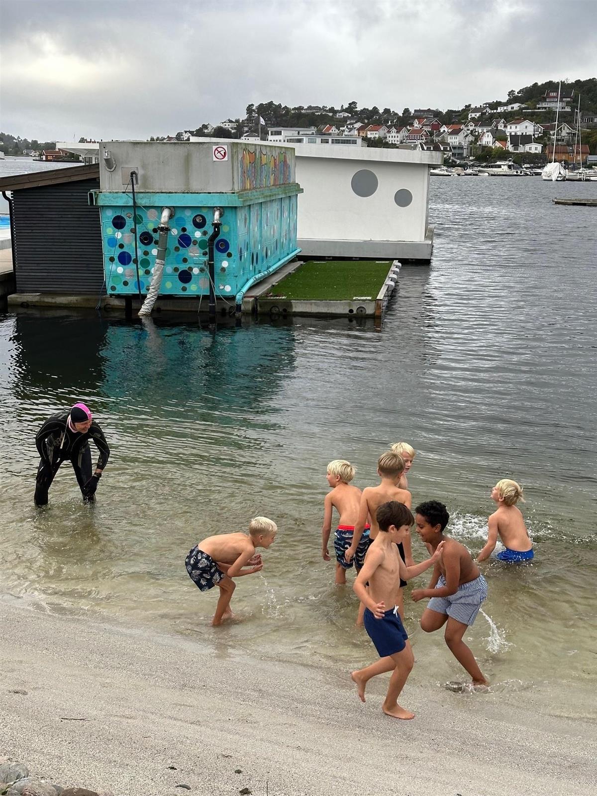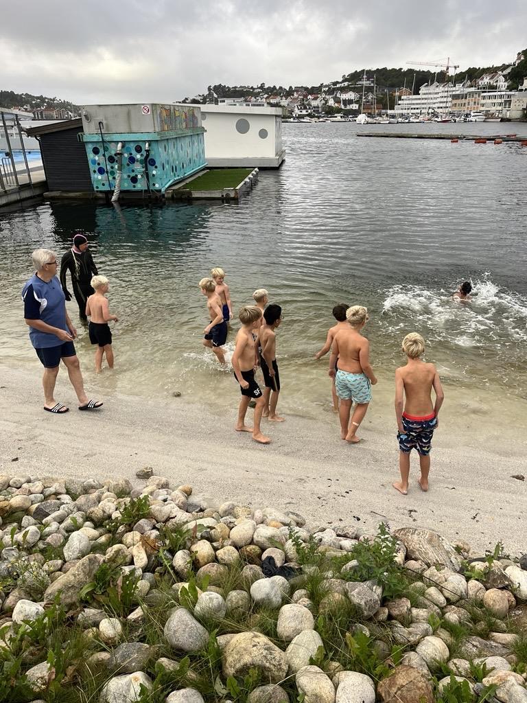 Deretter “prøvde” vi vannet. Alle måtte øse vann på kroppen først. Ingen skulle hoppe rett i vannet. Dette gjorde vi for å unngå at kroppen får “sjokk”. Termometeret viste nesten 18 grader, og noen elever syntes det var “nydelig”, mens andre mente det var “iskaldt”.