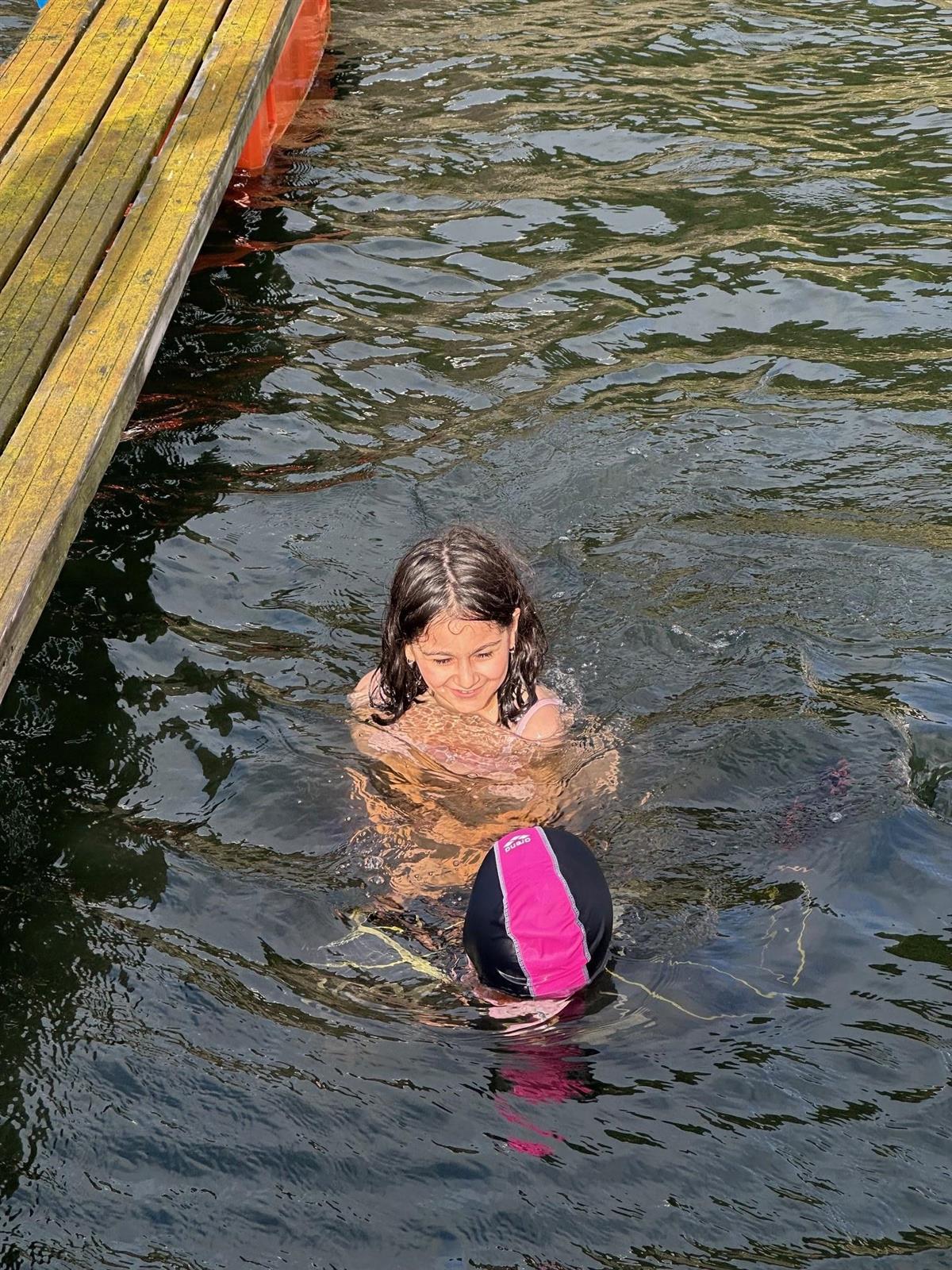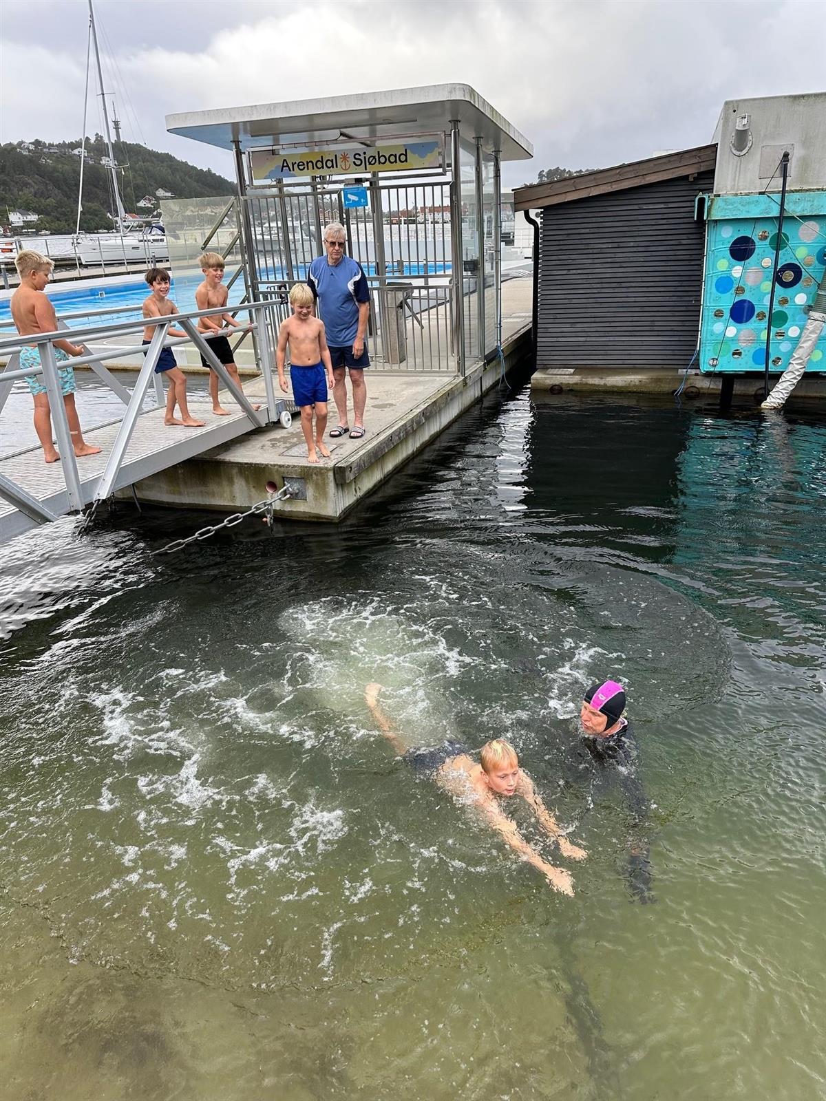 Andre øvelse var å svømme en runde langsmed brygga. Avstanden var cirka 10 meter. Denne øvelsen var frivillig, men nesten alle (75 %) kom seg rundt, med litt hjelp. (Hurra!)