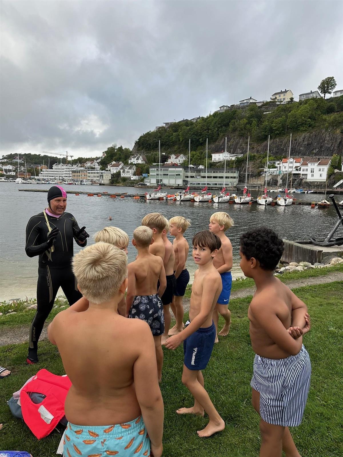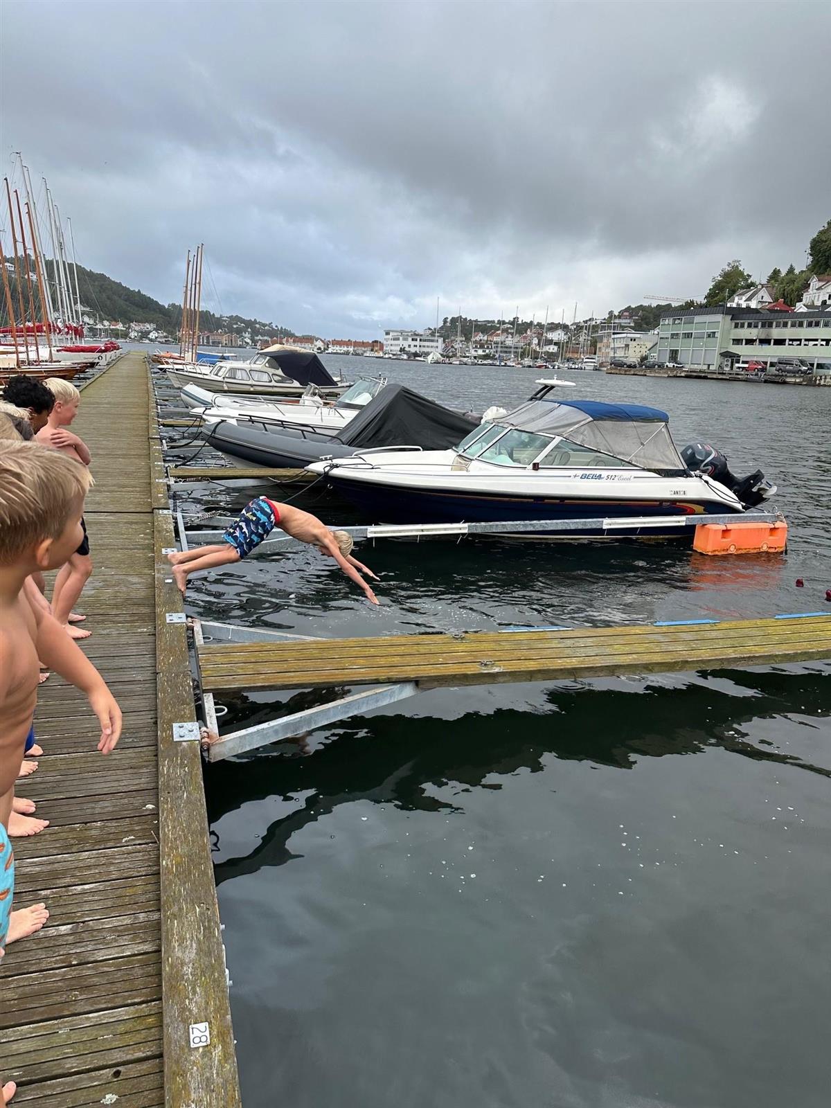 Første øvelse var å hoppe fra lav brygge og svømme inn til Bystranda. Avstanden var cirka 5 meter. Det klarte alle. (Hurra!)