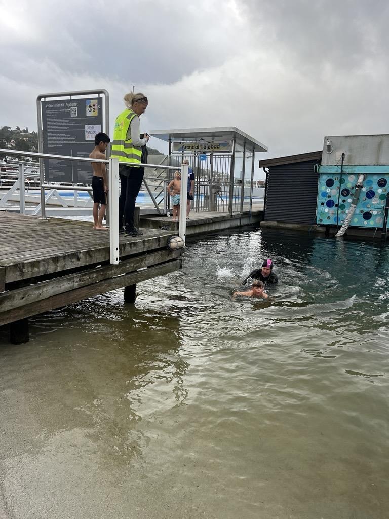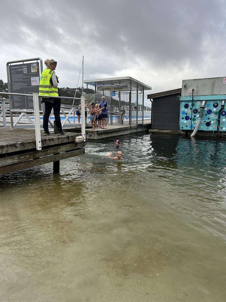 Først kartla vi ulike forhold rundt sikkerheten sammen med elevene. Hvordan ser vi forskjell på dypt vann og grunt vann? Hvorfor er det lurt å hoppe i forhold til å stupe? Hvor finner dere livredningsutstyr her på Bystranda?
