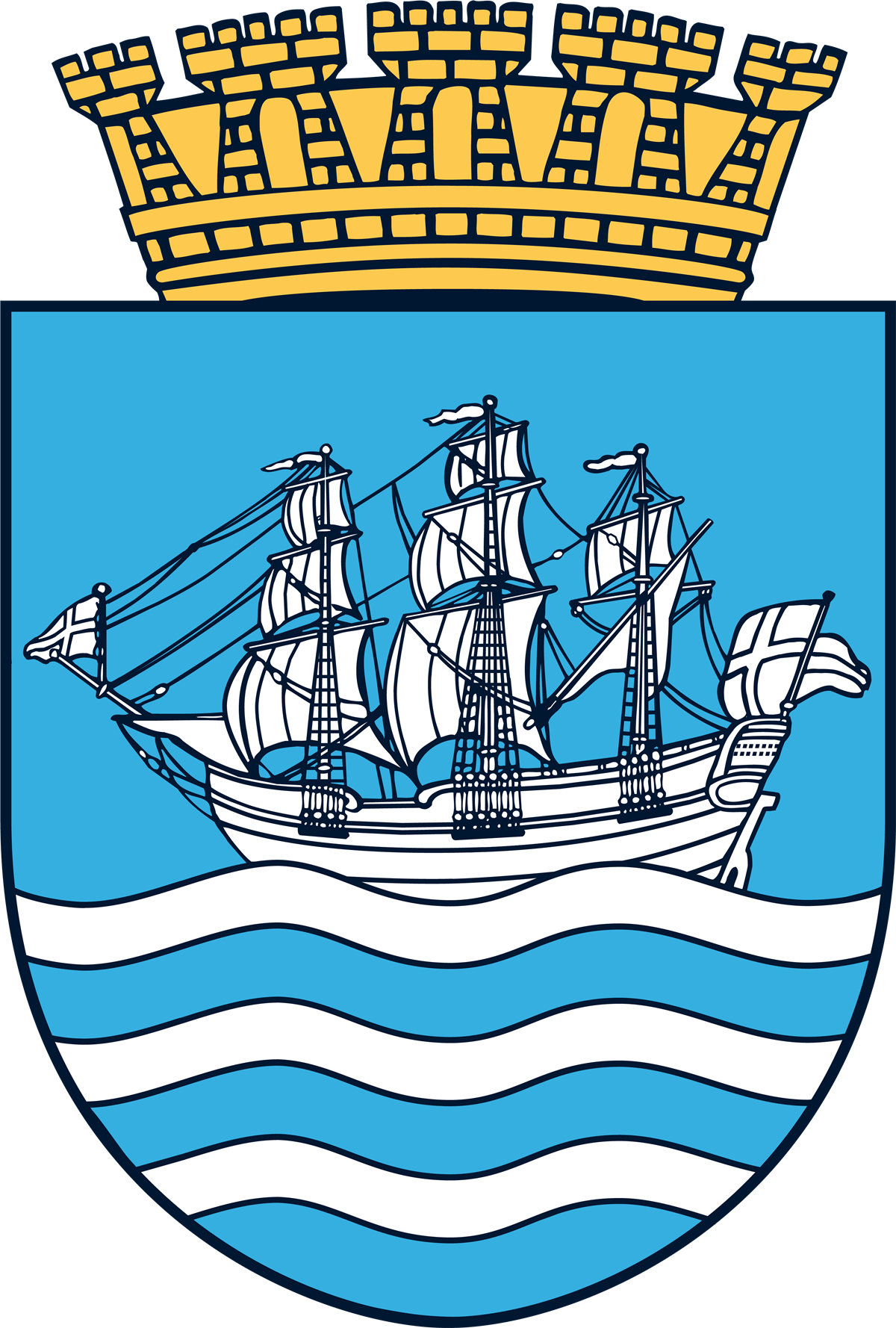 Byvåpenet viser en krysseiler, et tremastet skip av 1700-tallstype, på tre bølger. Skjoldet har turkis bakgrunn og hvitt motiv. Kronen med fem tagger er i gull.