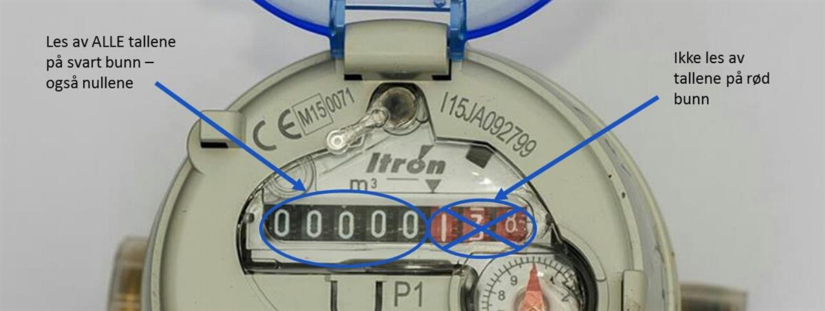 Bilde av gammel vannmåler - Klikk for stort bildeLes av de 5 eller 6 første sifrene fra venstre. Ta med nuller foran. Hvis du har digital måler (blå ring rundt telleverket) vil målerstanden bli lest av automatisk.